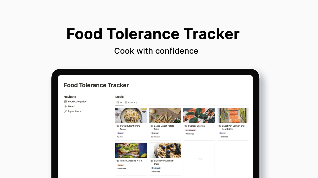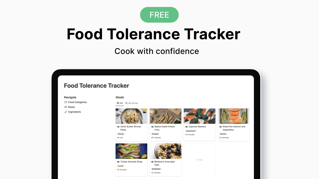 This is the free version of the Food Tolerance Tracker. For access to over 300+ ingredients to get you started, click here.Cook with confidenceThis template helps you track your food tolerances by helping you build recipes with ease so you know exactly what you can and cannot eat.