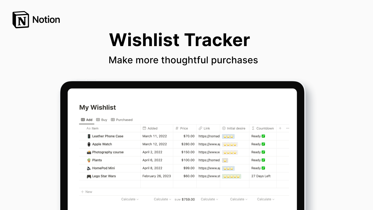 This template will help you track your desired purchases all in one place. Give yourself time to think about it with the automatic countdown to stop you from making impulse buys :) Make thoughtful purchasesTrack your wishlist in one placeSee a running total of all your items