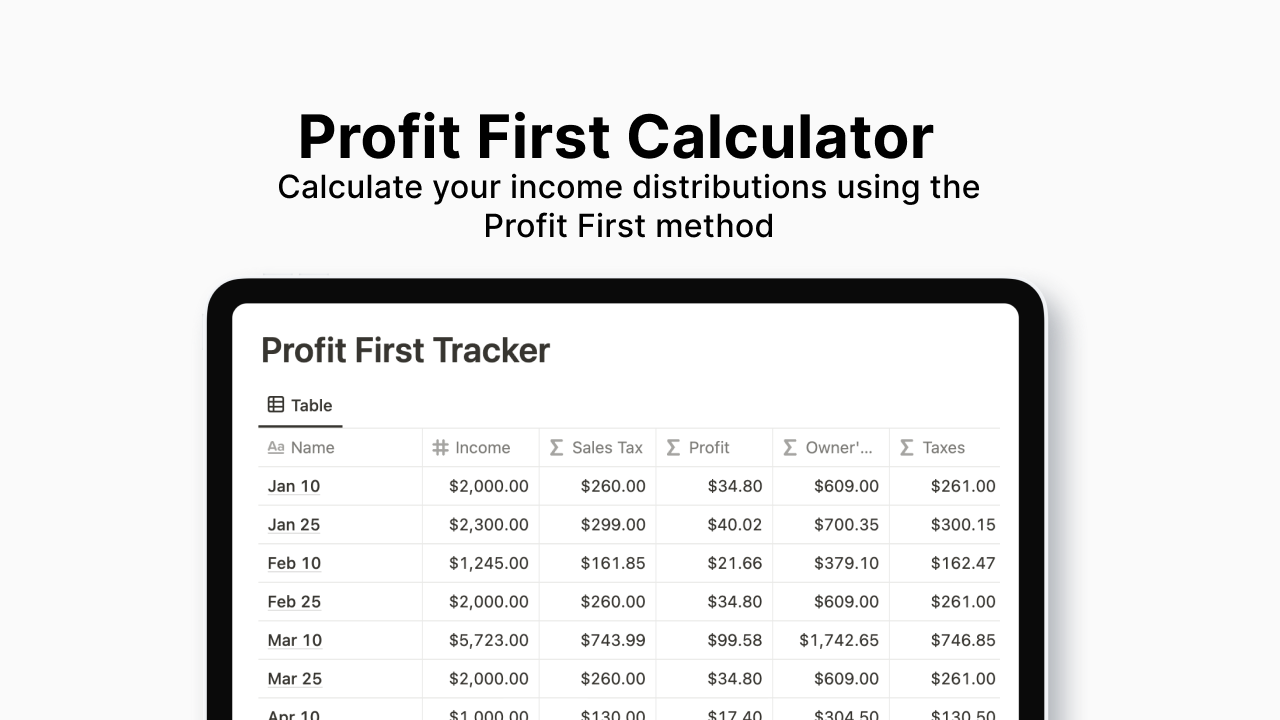 This template helps you calculate your income distributions using the Profit First method. By entering your income, it will calculate: Sales TaxProfitOwner’s EarningsTaxesProfit DistributionOPEX (Operating Expenses) You can also change the default percentages if needed.