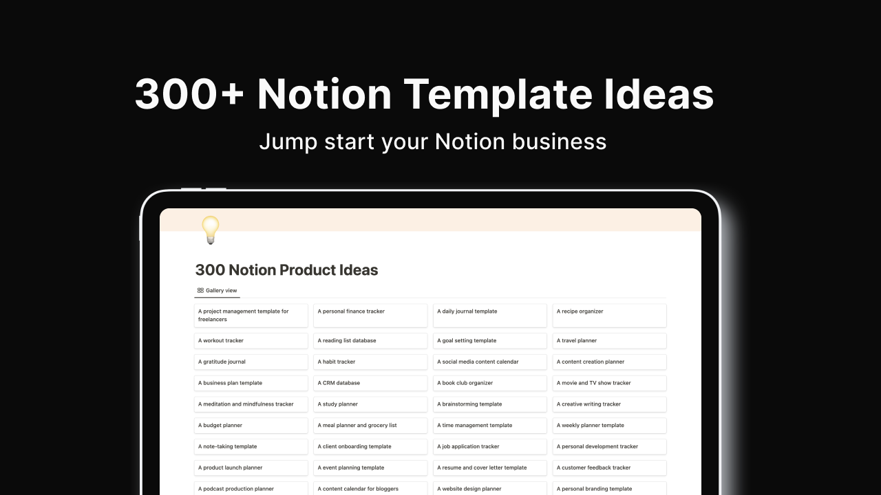Stop brainstorming and start creating As a busy professional, I understand the importance of staying productive and on top of your game. Especially if you’re only doing this part time (like me), you don’t want to get stuck brainstorming and feeling like you’re not making progress. That’s why I created this guide. With over 300 ideas to get your creativity flowing, you can jump start your Notion business.