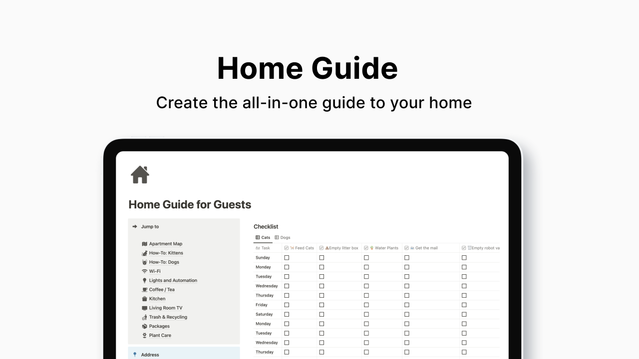 Tired of constantly sharing the WiFi password or giving your petsitter instructions every time? This Notion template will help you create the all-in-one guide to your home. What's included 11 page templates to fill out all the important information about your homeDaily checklist for petsitters (Dog and Cat edition!)Minimal style icons and layoutStep-by-step instructions