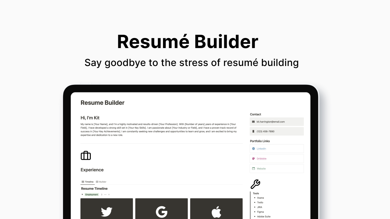 Build your resume quickly using this fast and minimalist Notion template. This product includes a multi-section layout to showcase your job positions, skills, and experience. What's included Step-by-step instructions Easy to fill in promptsJob entry templateDesign for Employment, Freelance, Internship, and Volunteer positions